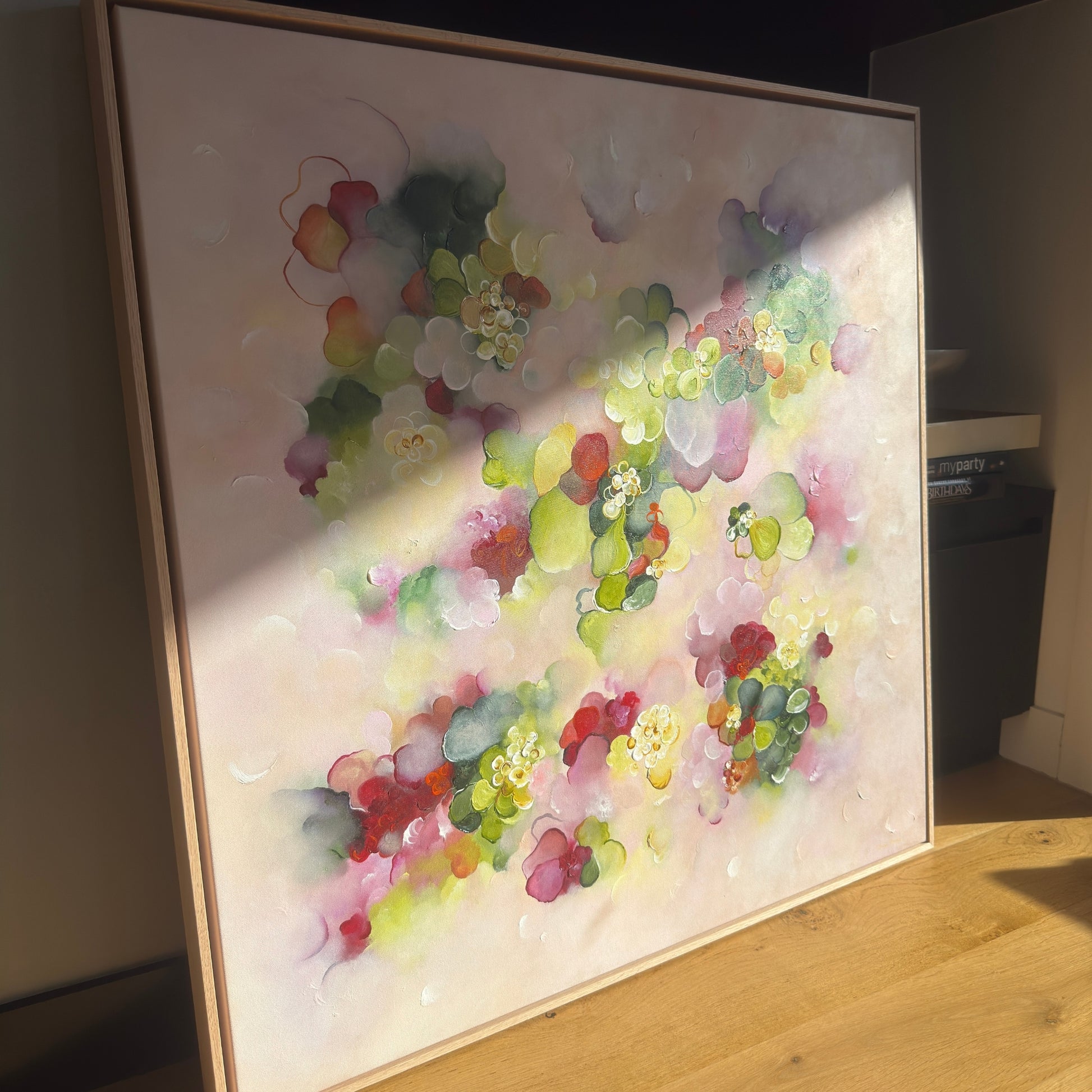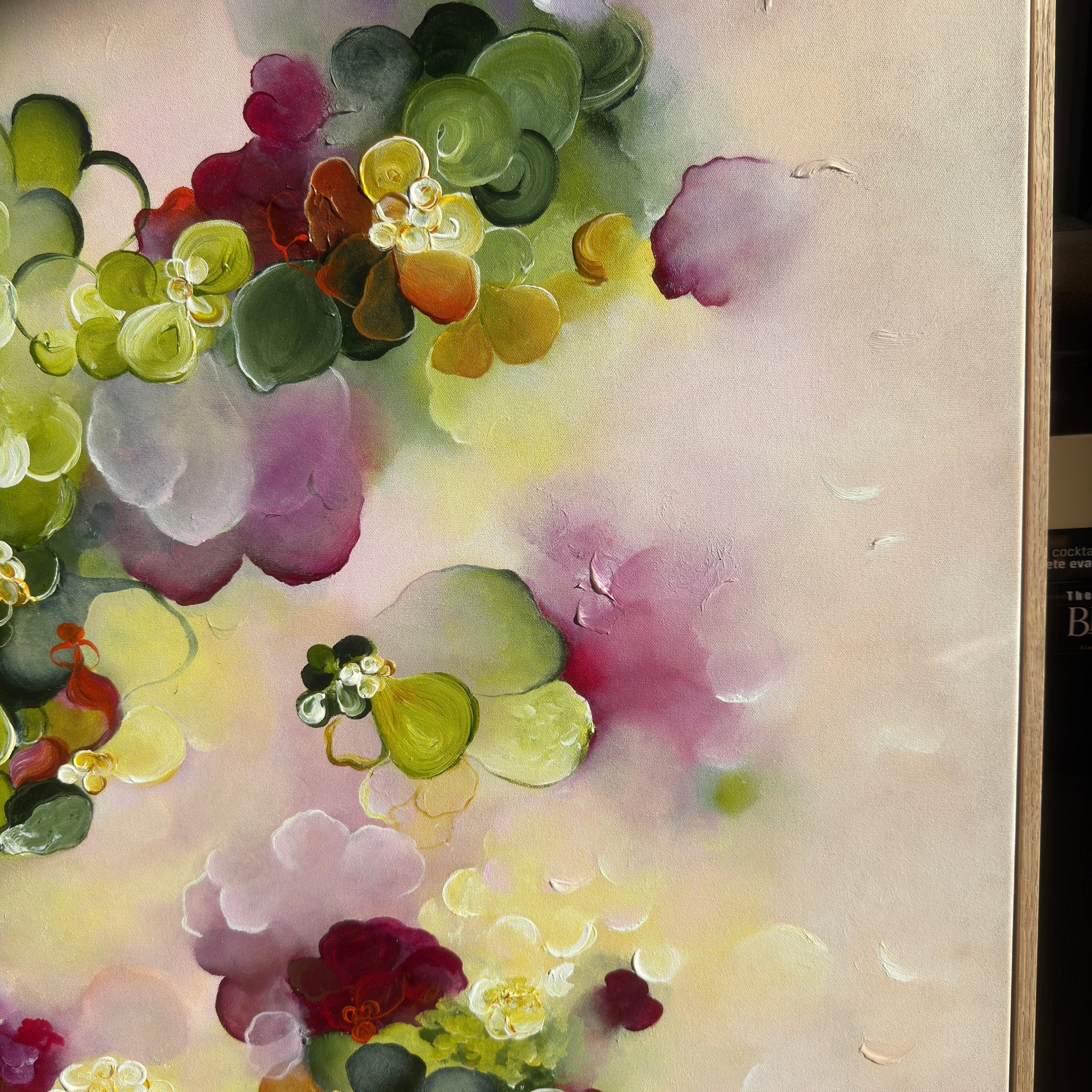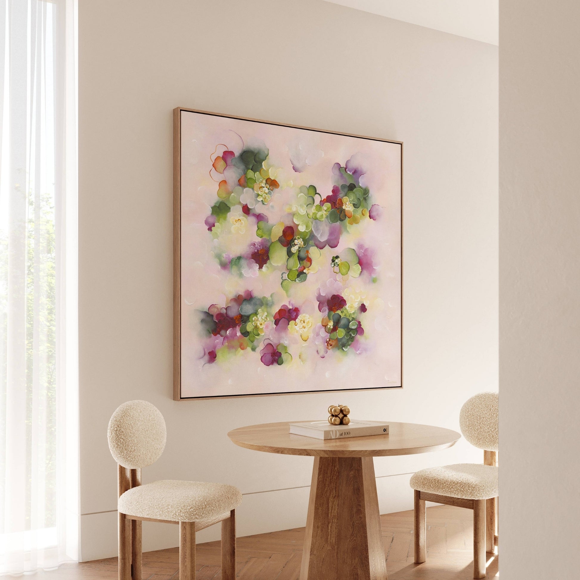 Bed of Flowers is a vibrant celebration of softness, joy, and emotional renewal. With radiant pinks, golden yellows, and grounding greens, she brings a sense of romantic nostalgia and feminine energy into your space.