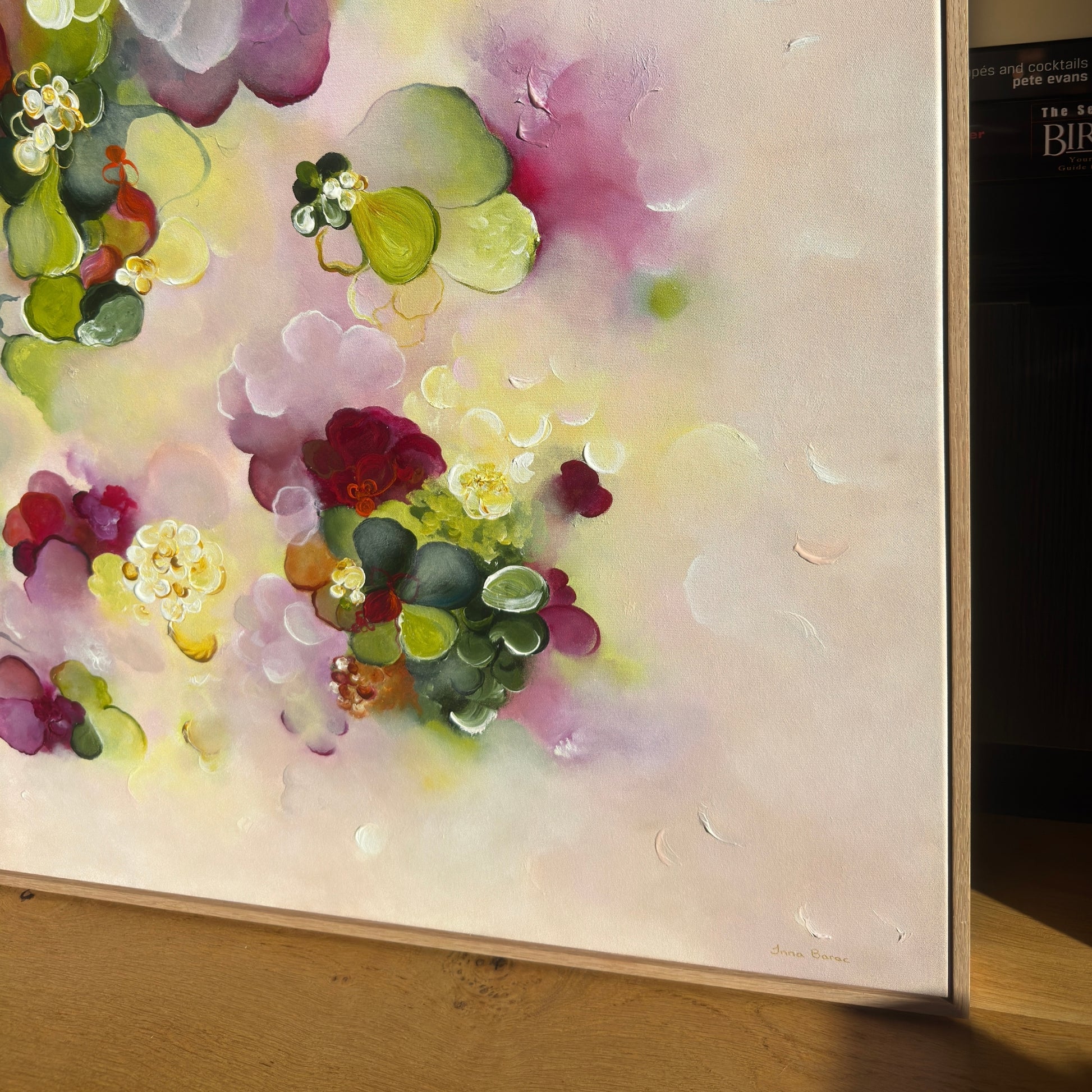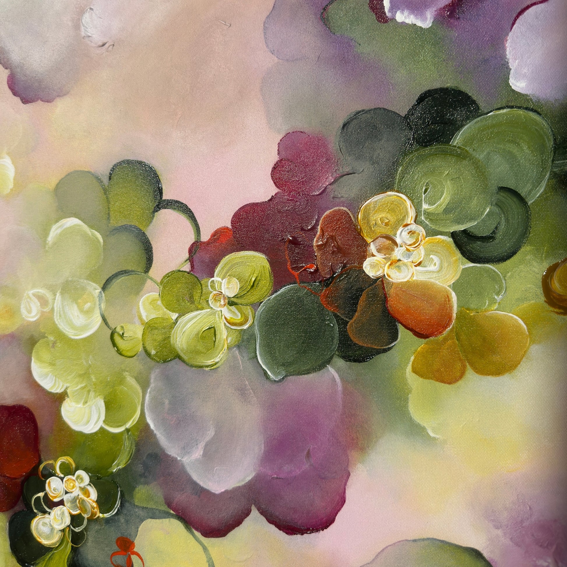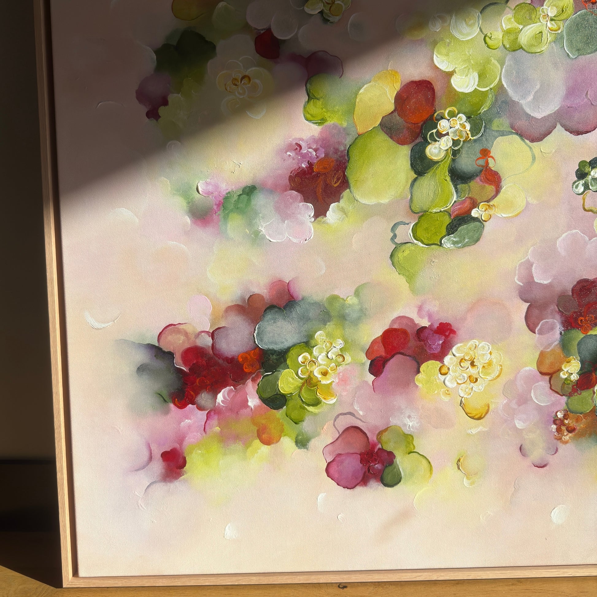 Bed of Flowers is a vibrant celebration of softness, joy, and emotional renewal. With radiant pinks, golden yellows, and grounding greens, she brings a sense of romantic nostalgia and feminine energy into your space.