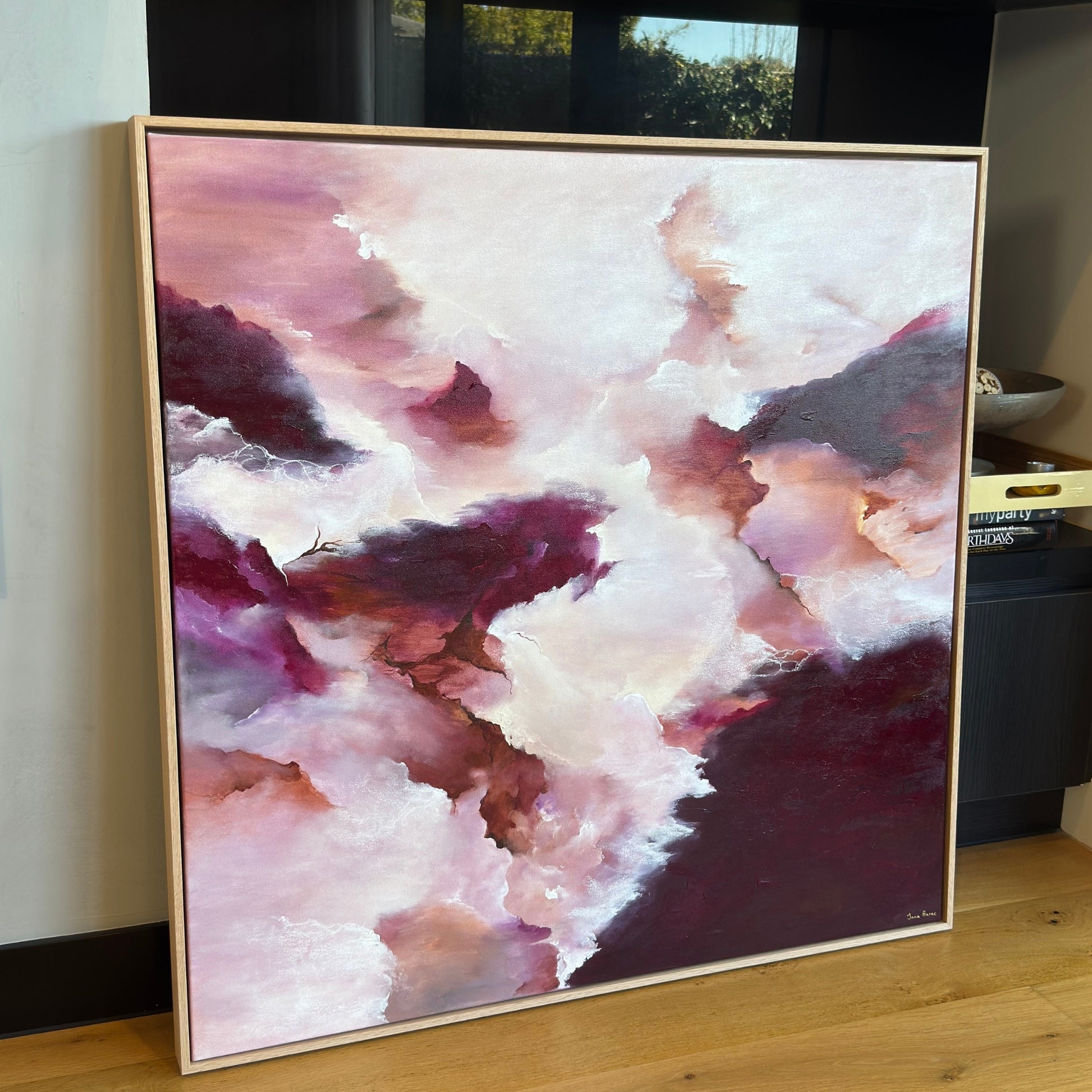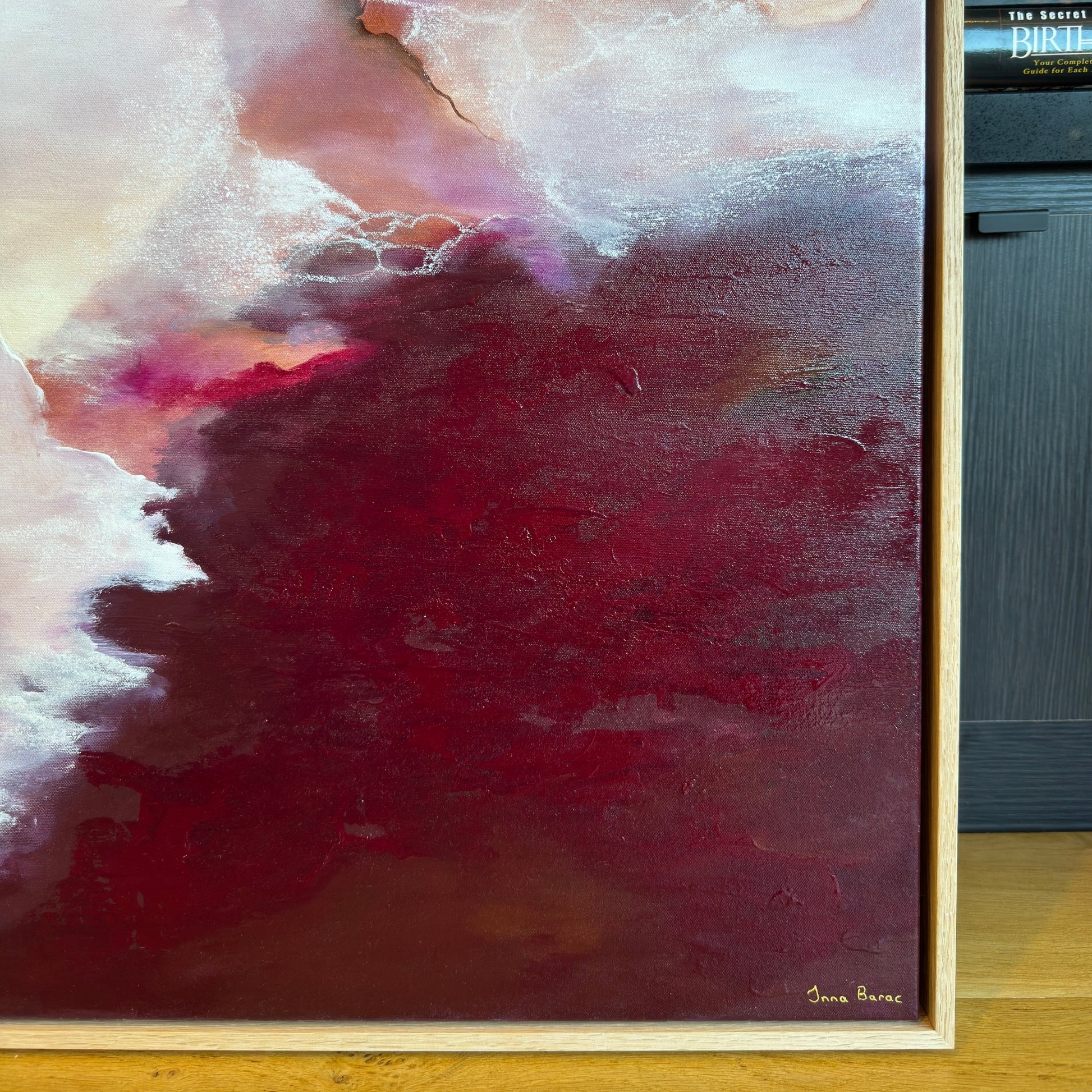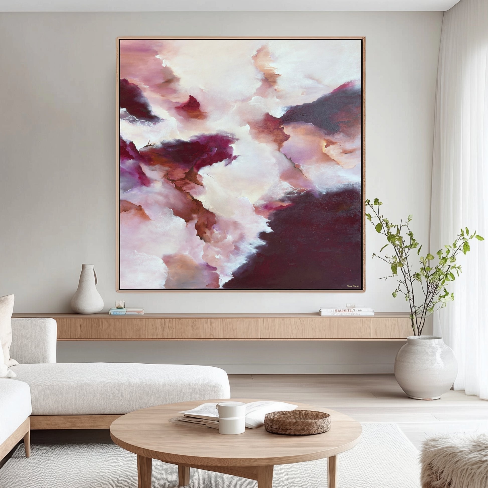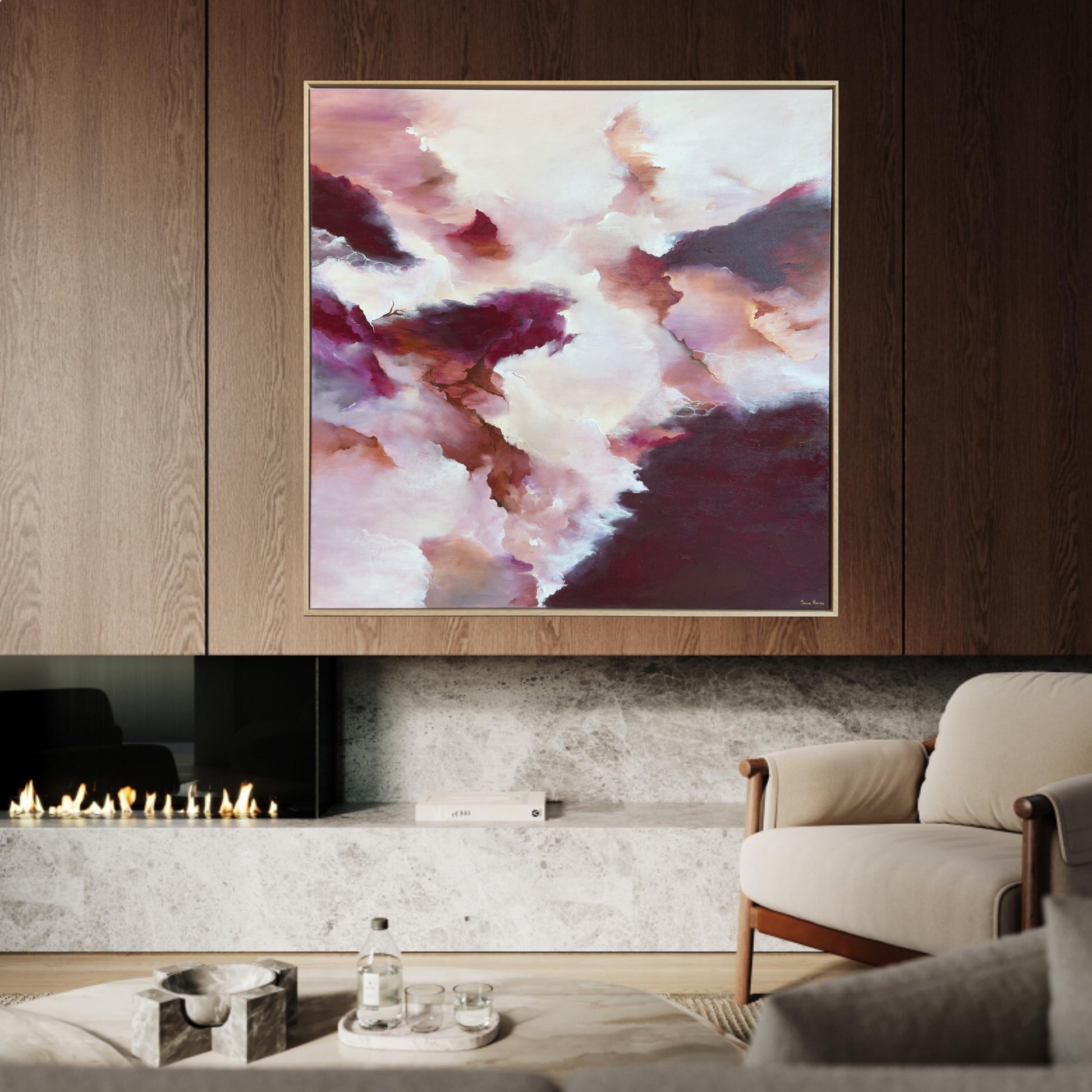 Beneath My Feet is a large-scale landscape that does more than decorate — it transforms. With rich burgundy and earthy brown tones, she anchors the room with warmth and depth, offering a bold yet neutral presence that feels both powerful yet grounding and serene.
