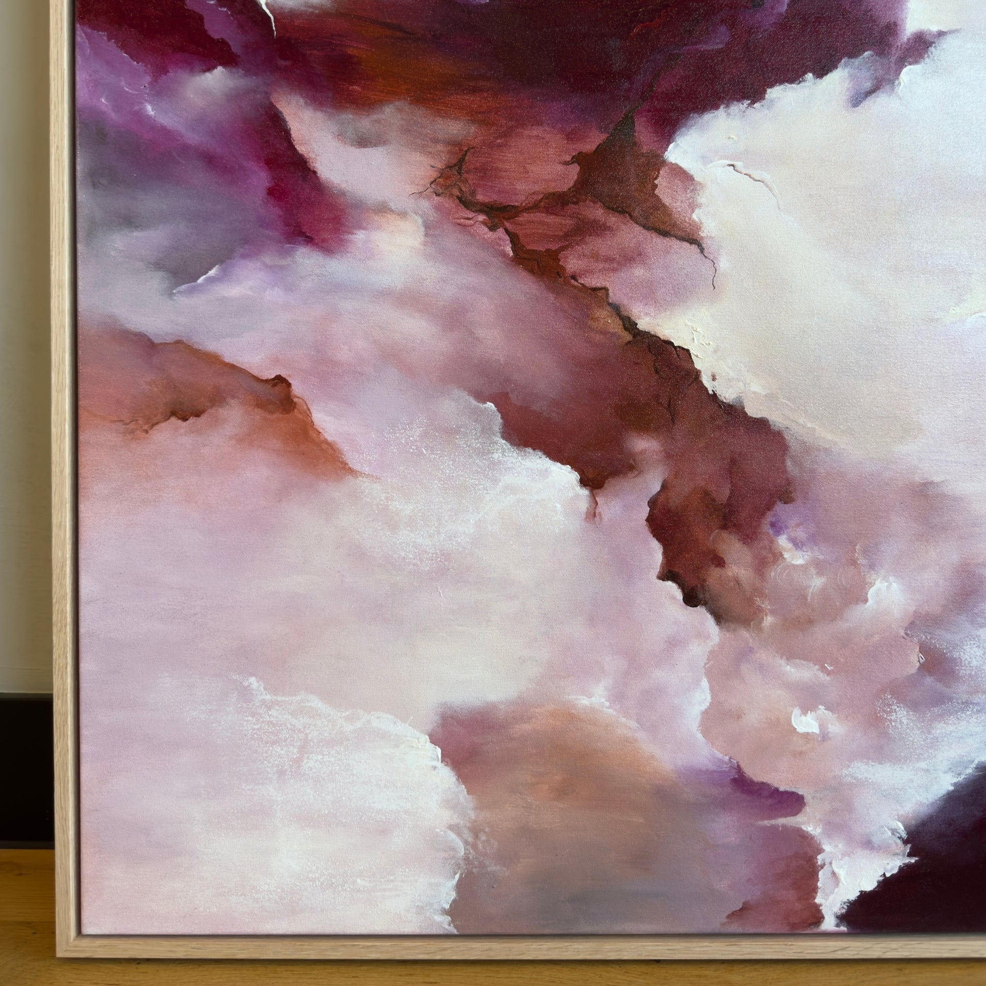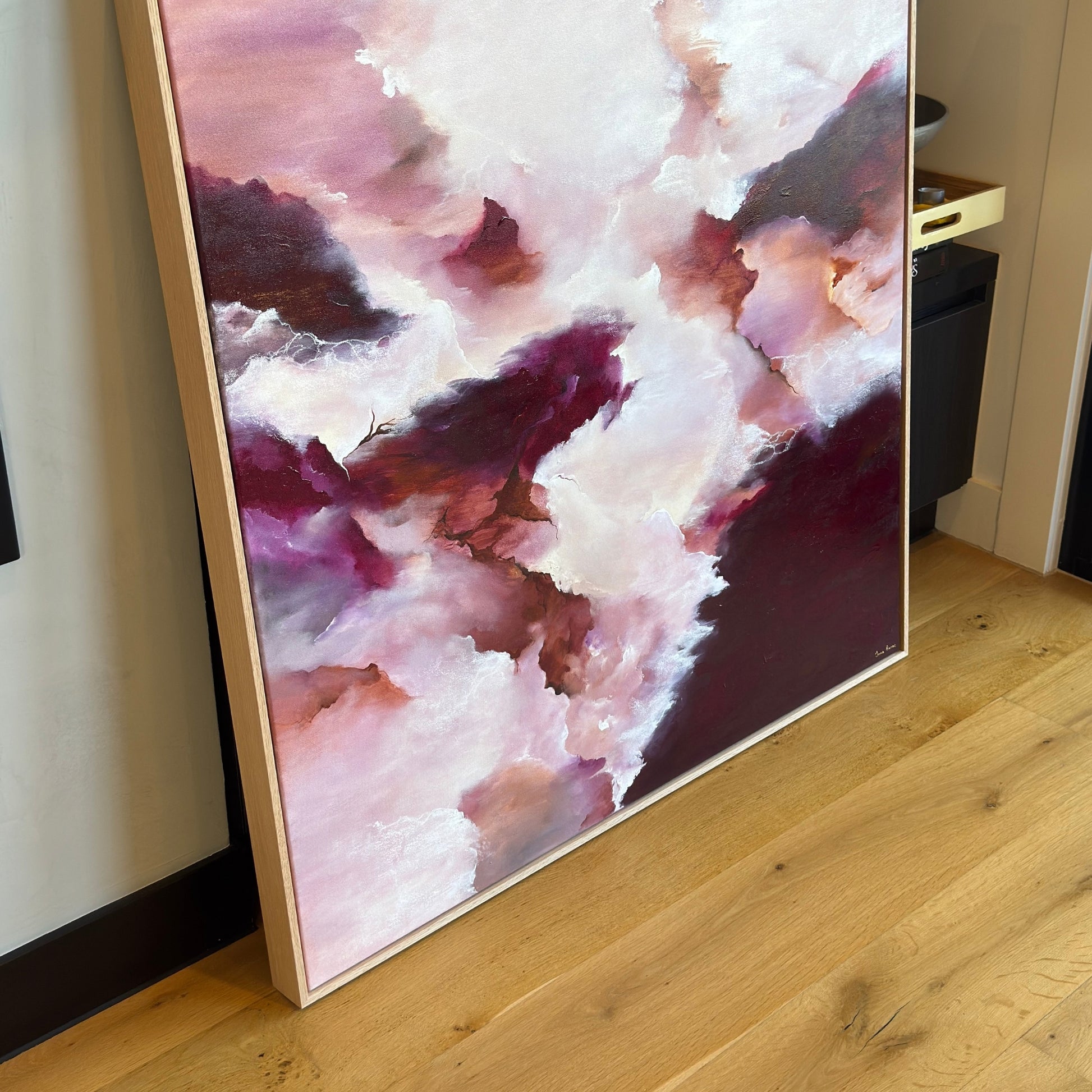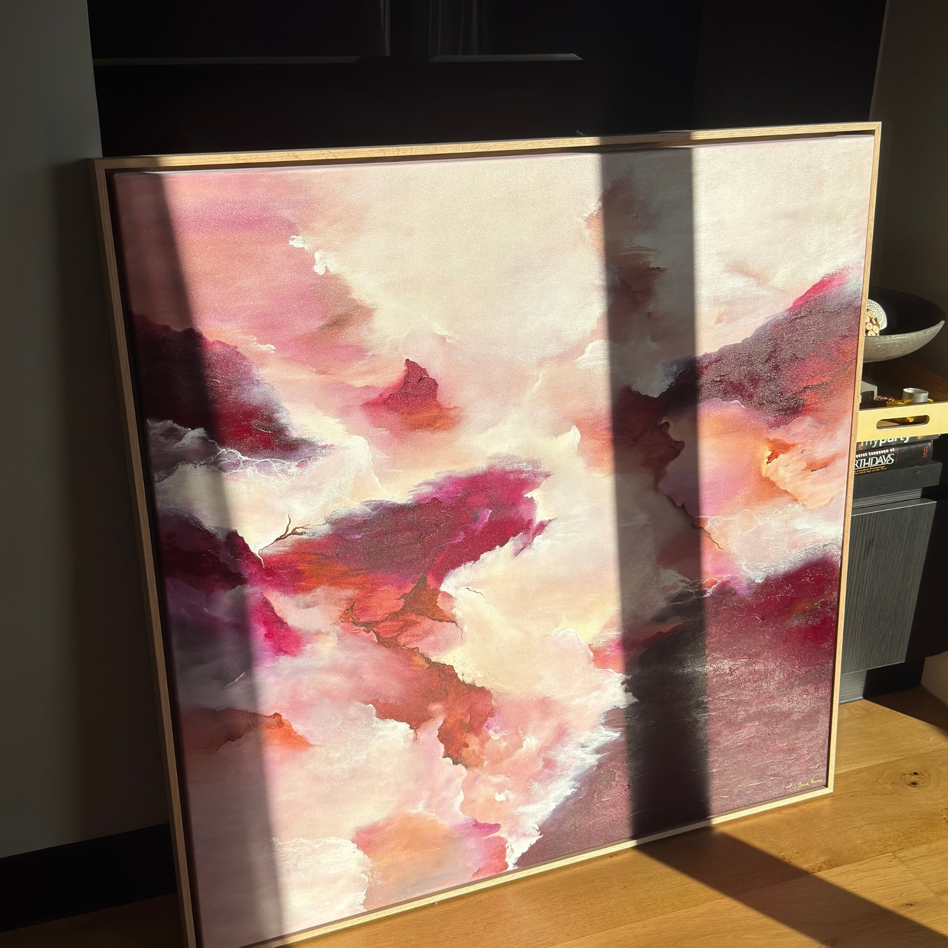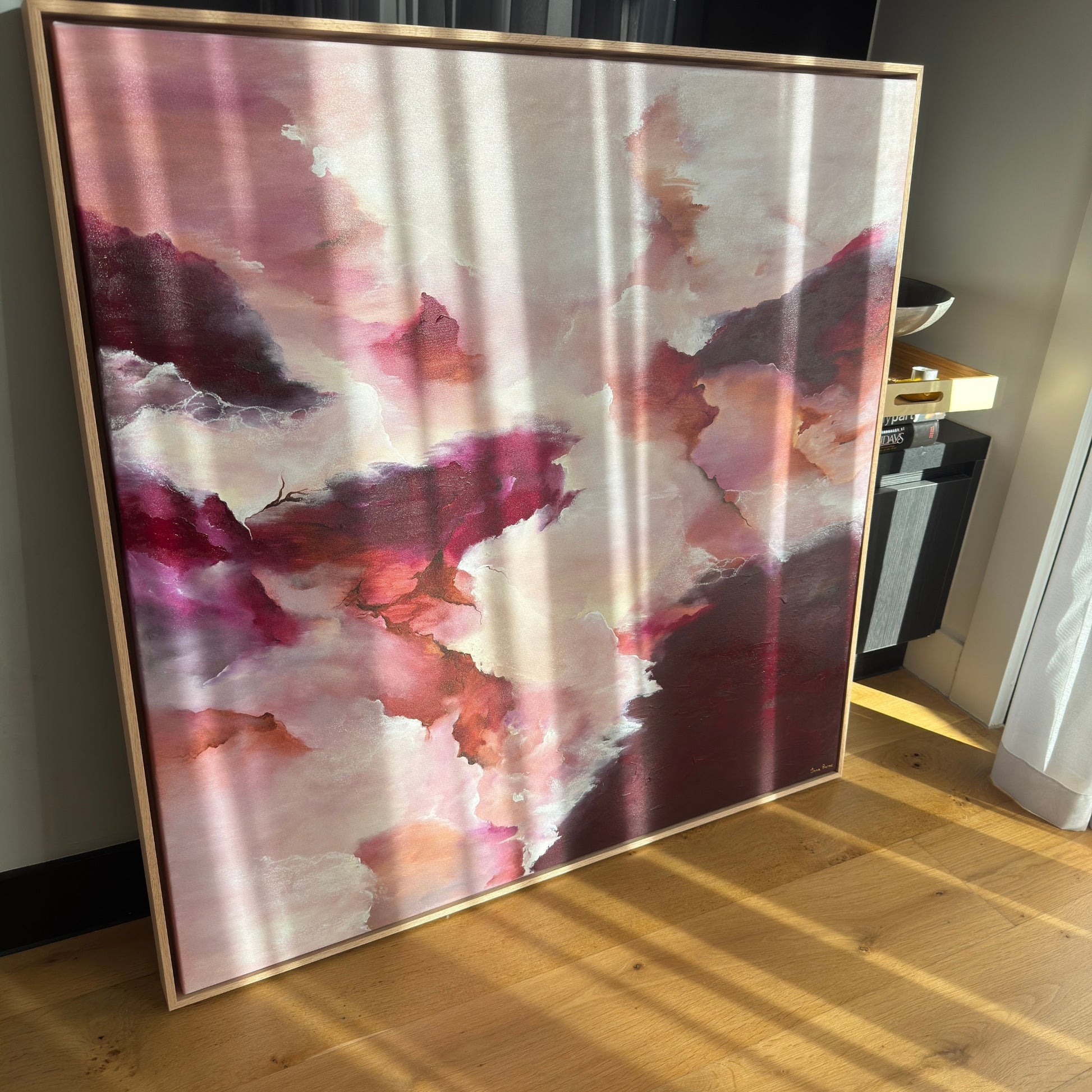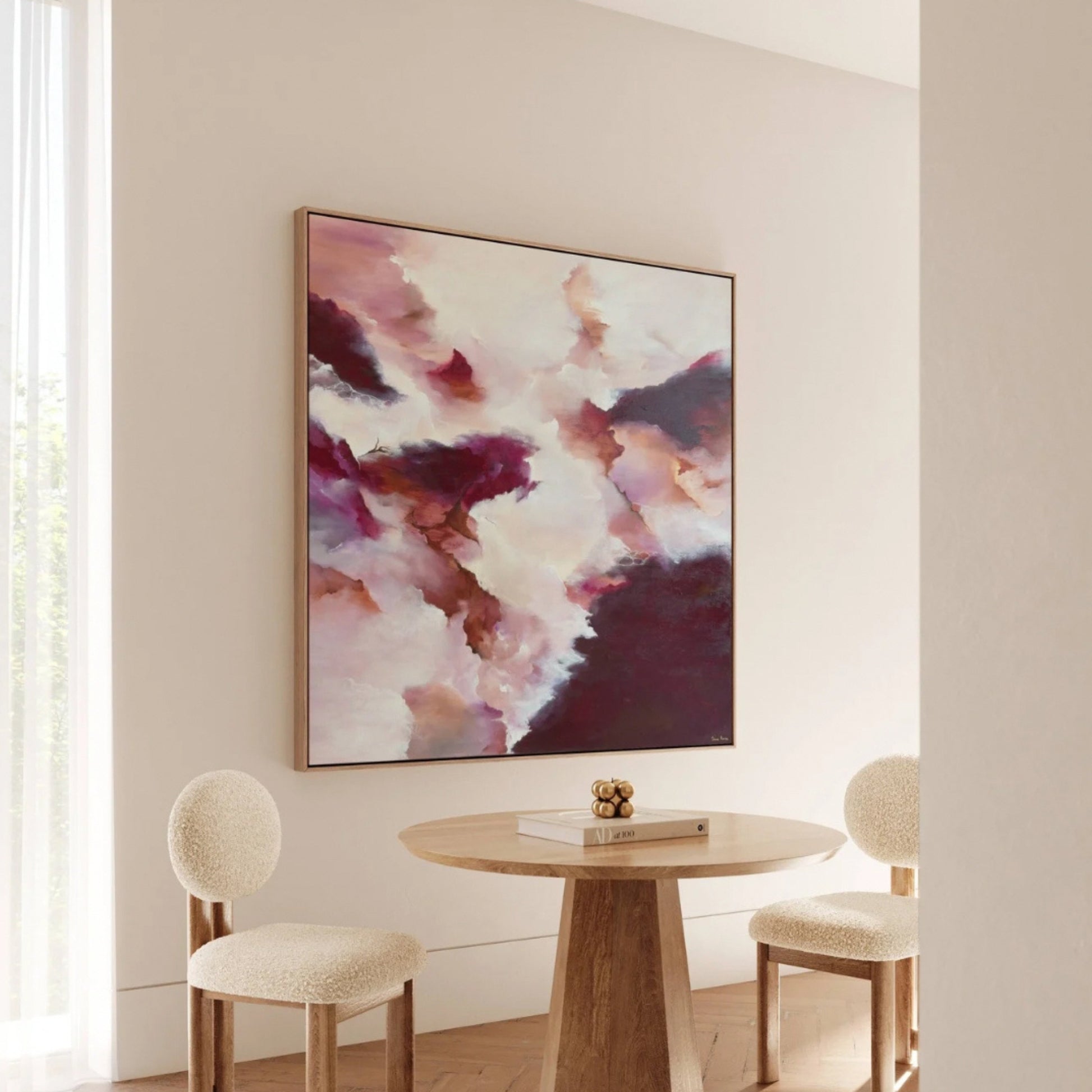 Beneath My Feet is a large-scale landscape that does more than decorate — it transforms. With rich burgundy and earthy brown tones, she anchors the room with warmth and depth, offering a bold yet neutral presence that feels both powerful yet grounding and serene.