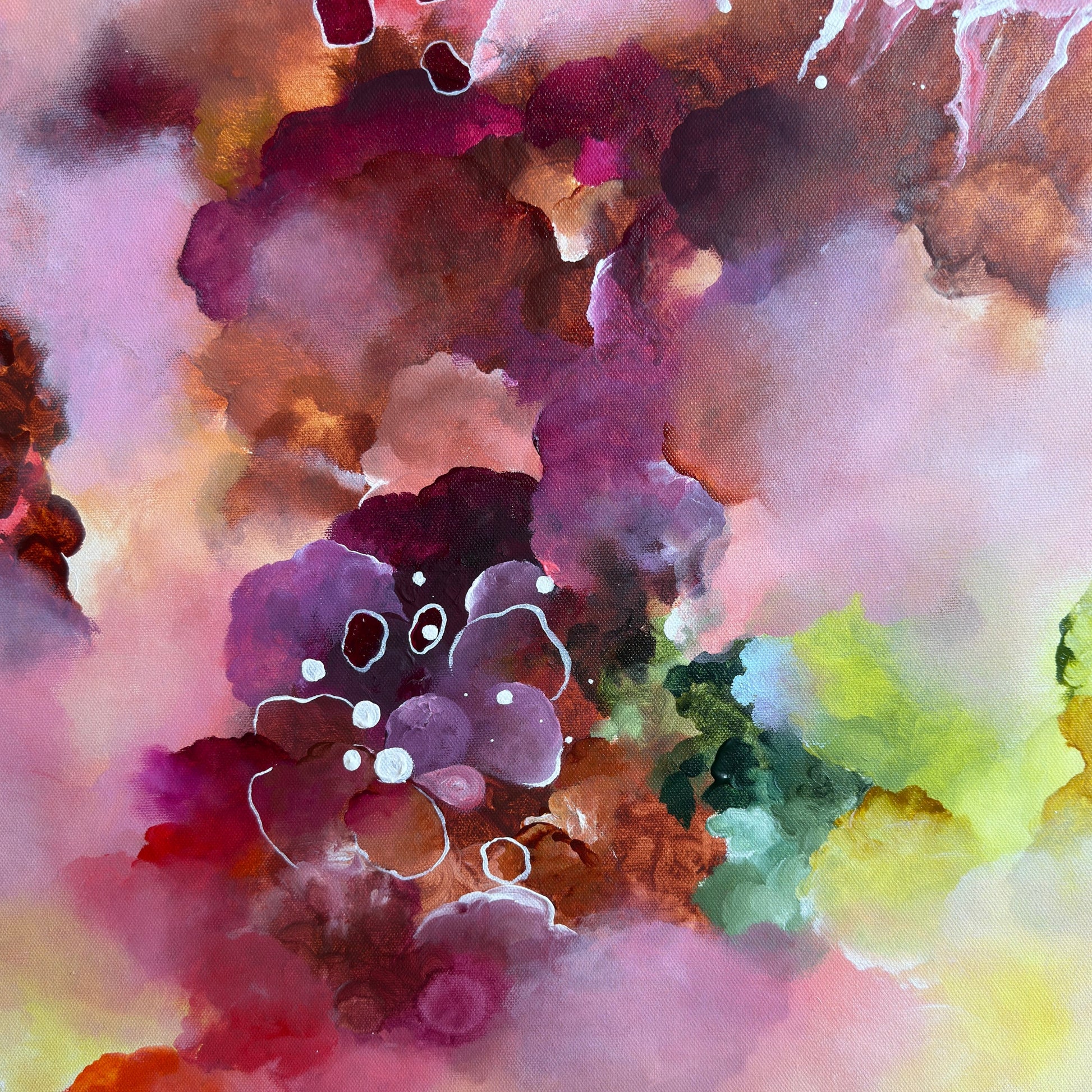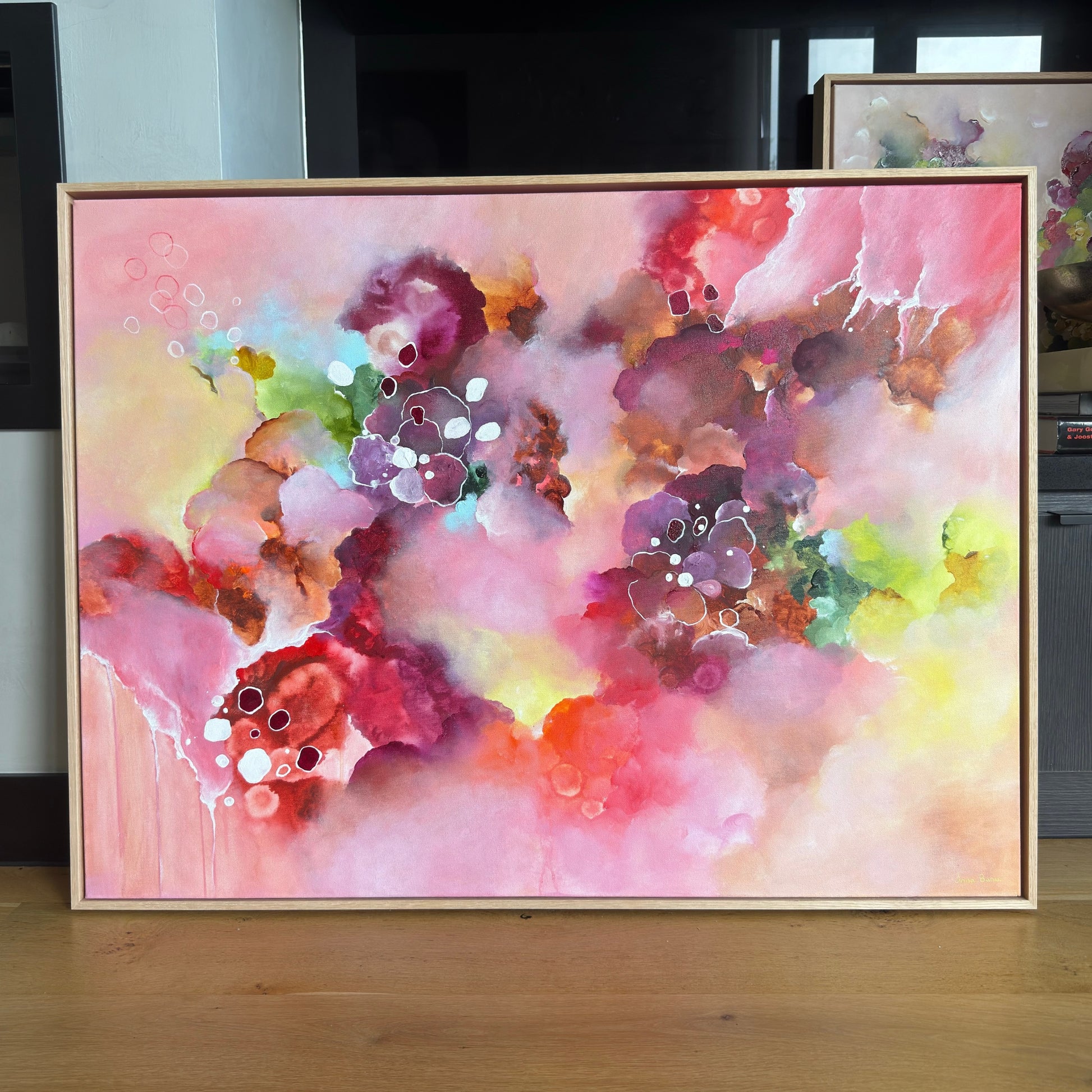 A statement piece alive with rich oranges, pinks, burgundy, greens, and sunlit yellows — blending in effortless harmony and movement. It feels like a deep exhale and utter freedom.