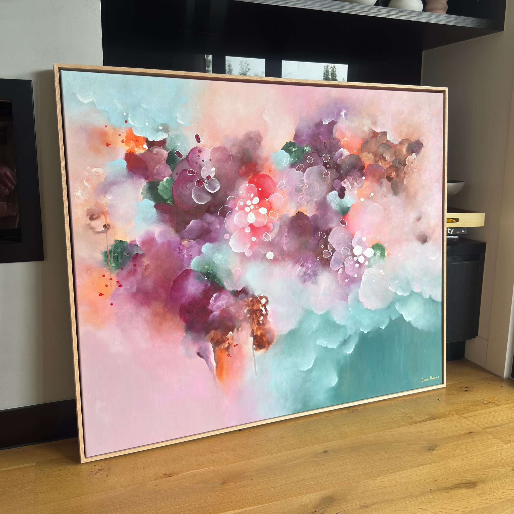 She is just as the name promises — pure, soulful, joy-filled magic. She’s an explosion of colour, bursting with joyful energy: rich maroons, earthy browns, playful greens, soft sky blues, and pops of oranges that seem to dance across the canvas. If you’ve been waiting for that showstopper — the one that grabs attention and floods a room with joy and light— this is her.